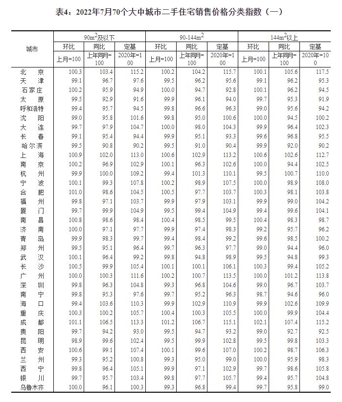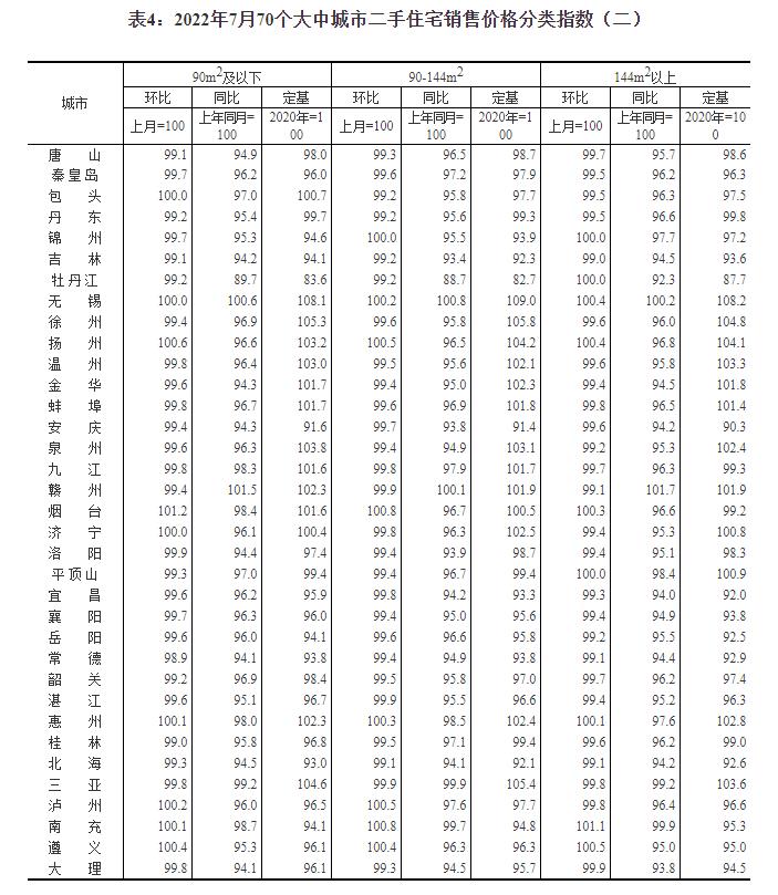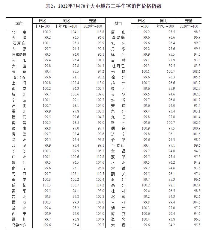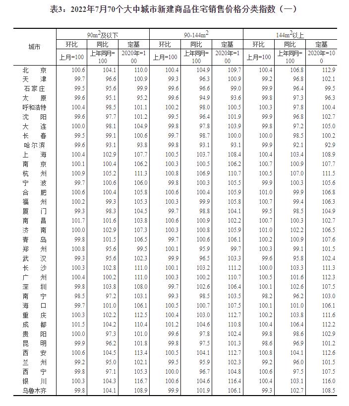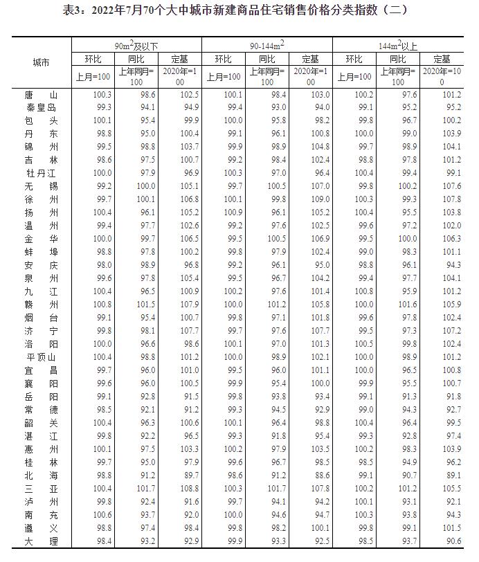 2022年7月份70个大中城市商品住宅销售价格变动情况