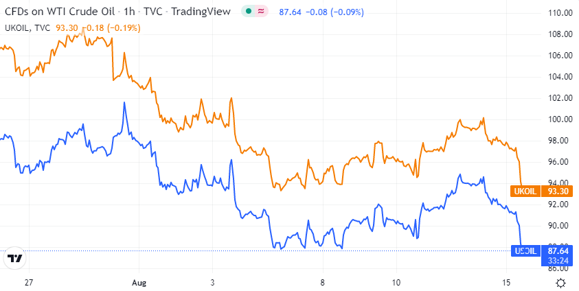 具体行情显示,纽约商品交易所9月交货的WTI原油期货价格下跌超4.5美元,至每桶87.55美元,日内跌幅达4.8%;10月交货的布伦特原油期货价格下跌超4.8美元,至每桶93.33美元,日内一度跌超5%。