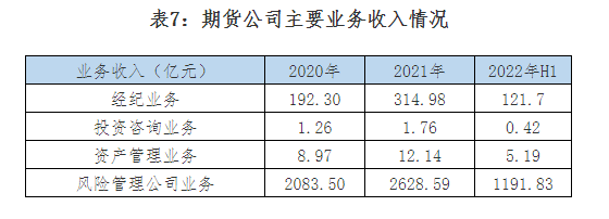 截至2022年6底,中国期货公司总资产1.58万亿元,净资产1753亿元,对比2021年底分别增长14.5%和8.61%,资本实力有所增强[4]。期货公司的主要业务包括经纪业务、投资咨询业务、资产管理业务和风险管理公司业务。具体来看,截至2022年6月底,经纪业务累计收入121.7亿元;投资咨询业务累计收入0.42亿元;资产管理业务累计收入5.19亿元,资管产品数量共1848只,产品规模 3444.89亿元。风险管理公司业务本年累计业务收入1191.83亿元。[5](表7)