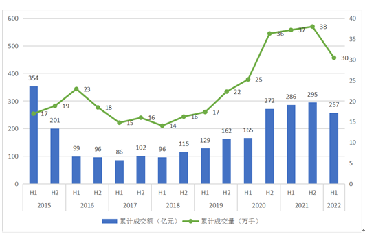 2022上半年,期货市场成交30.46亿手(单边,下同)和257.48万亿元,同比分别下降18.04%和10.08%(图1)。