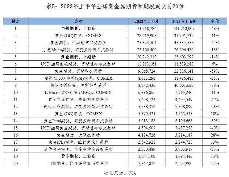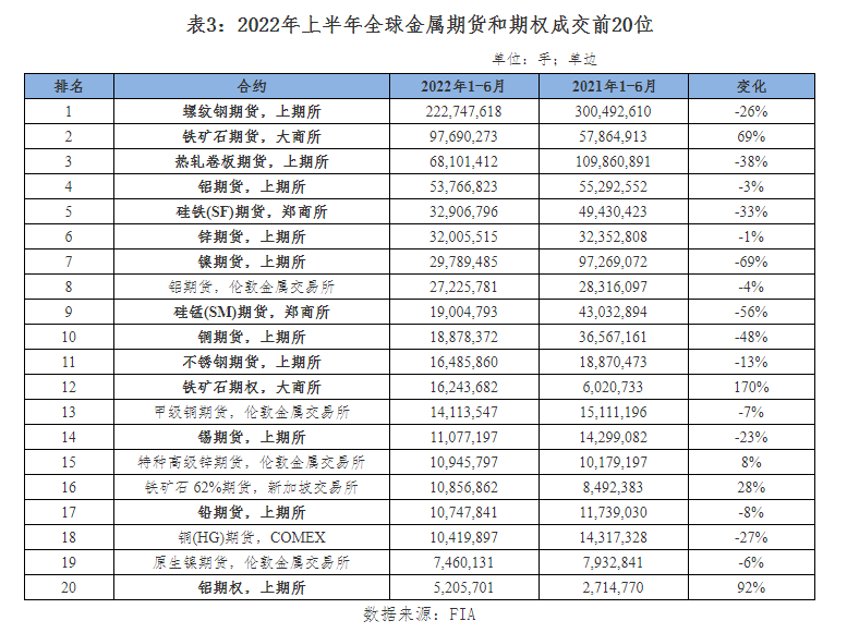 根据Futures Industry Association(FIA)统计的成交量数据,2022上半年,中国内地期货交易所中,大商所、郑商所、上期所和中金所在全球交易所期货和期权成交量排名中分别位居第8、第10、第12和第26位。上半年全球各类期货期权品种成交量排名中,中国品种在农产品品种前20名中占有16席,金属品种前20强中占有14席,能源品种前20强中占有5席,贵金属品种前20强中占有3席。
