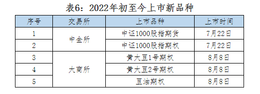 截至本报告发布[2],内地期货市场年初至今共新上市了5个品种(表6),包括1个期货品种、4个期权品种。其中,中国金融期货交易所上市了中证1000股指期货、中证1000股指期权;大连商品交易所上市了黄大豆1号期权、黄大豆2号期权、豆油期权。