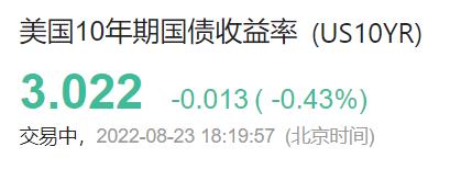 截至北京时间8月23日18时19分,美国十年期国债收益率报3.022%。