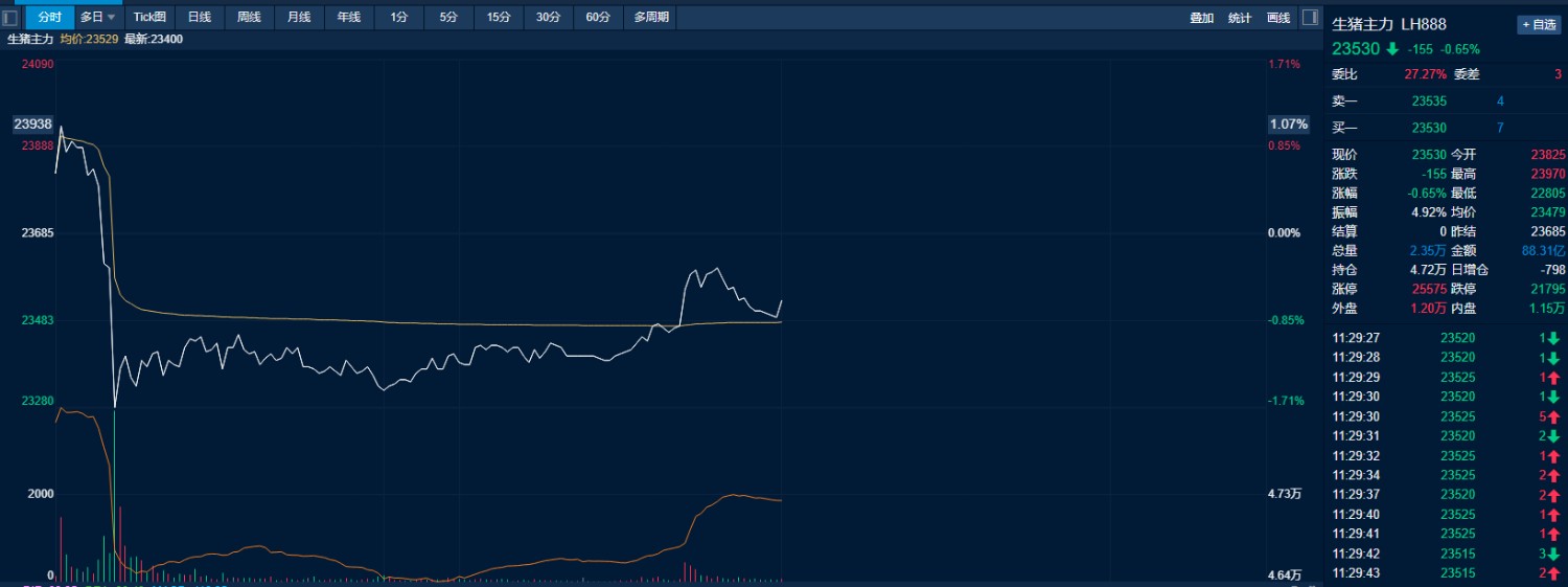 随着国家9月开始投放猪肉的消息出炉,生猪市场短线看涨情绪受到打压。截至发稿时,生猪期货主力合约日内一度涨超1%,最高至23970元/吨,但目前由涨转跌,且跌幅超1.3%,早盘低点一度至22805元/吨。
