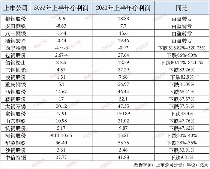 安阳钢铁(600569.SH)、八一钢铁(600581.SH)、酒钢宏兴(600307.SH)上半年的净利润也由盈转亏,分别亏损8.63亿元、1.44亿元和0.44亿元。