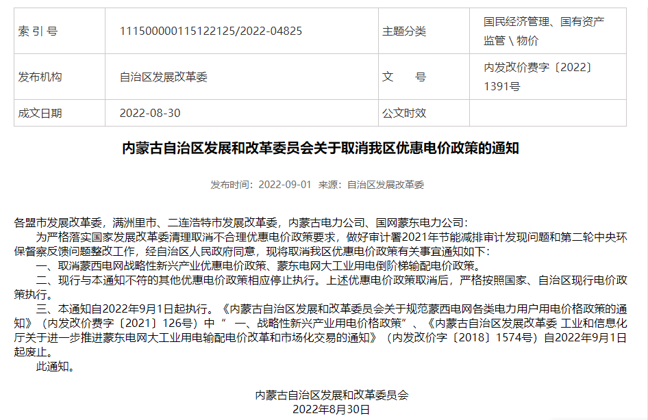 当地自2022年9月1日起取消优惠电价政策。通知称,取消蒙西电网战略性新兴产业优惠电价政策、蒙东电网大工业用电倒阶梯输配电价政策。现行与本通知不符的其他优惠电价政策相应停止执行。上述优惠电价政策取消后,严格按照国家、自治区现行电价政策执行。