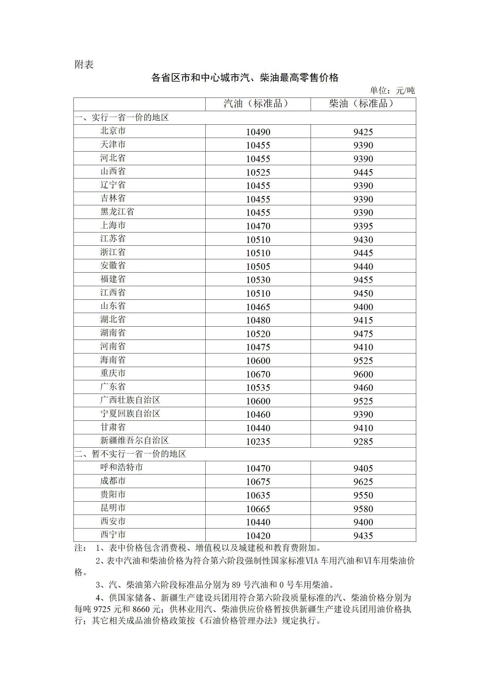 根据近期国际市场油价变化情况,按照现行成品油价格形成机制,自2022年9月6日24时起,国内汽、柴油价格(标准品,下同)每吨分别提高190元和185元。调整后,各省(区、市)和中心城市汽、柴油最高零售价格见附表。相关价格联动及补贴政策按现行规定执行。