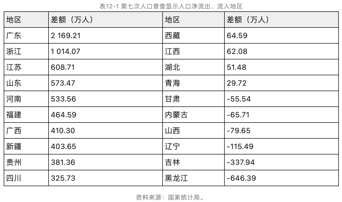 表12-1显示的几个人口持续净流出地区,比较典型的是黑龙江、吉林和辽宁。以黑龙江省鹤岗市为例,在2010~2020年的10年间,鹤岗市区人口减少了17.12%。不久前有新闻报道,在鹤岗市用几万元就可以购买一处住房。