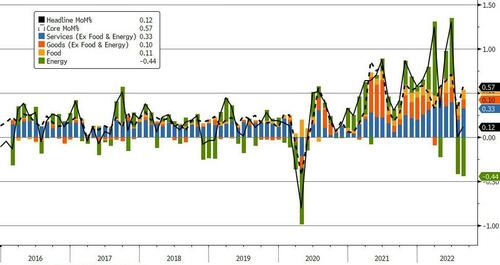 在分类解读时,人们通常会把通胀数据分为四大类——能源、食品、商品(核心)和服务(核心)四个大项。而正如下图所显示的那样,一目了然的是,能源环比价格确实出现了明显回落,但却抵不过其他几大类尤其是核心服务领域的CPI上涨。