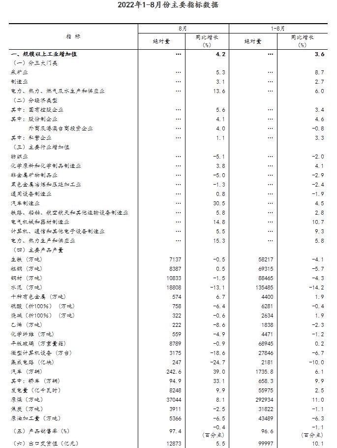 8月份,全国规模以上工业增加值同比增长4.2%,比上月加快0.4个百分点;环比增长0.32%。分三大门类看,采矿业增加值同比增长5.3%,制造业增长3.1%,电力、热力、燃气及水生产和供应业增长13.6%。装备制造业同比增长9.5%,比上月加快1.1个百分点。分经济类型看,国有控股企业增加值同比增长5.6%;股份制企业增长4.1%,外商及港澳台商投资企业增长4.0%;私营企业增长1.1%。分产品看,新能源汽车、移动通信基站设备、太阳能电池等绿色智能产品产量同比分别增长117.0%、25.7%、21.6%。1-8月份,全国规模以上工业增加值同比增长3.6%,比1-7月份加快0.1个百分点。8月份,制造业采购经理指数为49.4%,比上月上升0.4个百分点;企业生产经营活动预期指数为52.3%,上升0.3个百分点。1-7月份,全国规模以上工业企业实现利润总额48930亿元,同比下降1.1%。