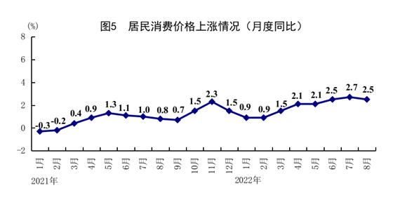 8月份,全国居民消费价格(CPI)同比上涨2.5%,涨幅比上月回落0.2个百分点;环比下降0.1%。分类别看,食品烟酒价格同比上涨4.5%,衣着价格上涨0.6%,居住价格上涨0.6%,生活用品及服务价格上涨1.3%,交通通信价格上涨4.9%,教育文化娱乐价格上涨1.6%,医疗保健价格上涨0.7%,其他用品及服务价格上涨2.2%。在食品烟酒价格中,粮食价格上涨3.3%,鲜菜价格上涨6.0%,鲜果价格上涨16.3%,猪肉价格上涨22.4%。扣除食品和能源价格后的核心CPI同比上涨0.8%,涨幅与上月相同。1-8月份,全国居民消费价格同比上涨1.9%。