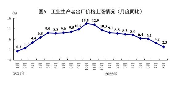 8月份,全国工业生产者出厂价格同比上涨2.3%,涨幅比上月回落1.9个百分点;环比下降1.2%。工业生产者购进价格同比上涨4.2%,环比下降1.4%。1-8月份,全国工业生产者出厂价格、工业生产者购进价格同比分别上涨6.6%、9.1%。