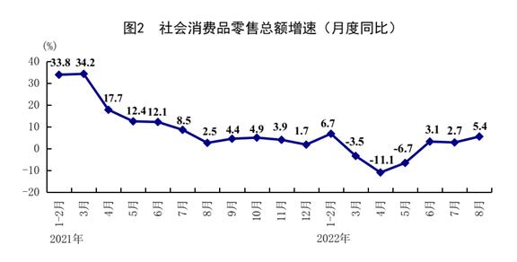 8月份,社会消费品零售总额36258亿元,同比增长5.4%,比上月加快2.7个百分点;环比下降0.05%。按经营单位所在地分,城镇消费品零售额31593亿元,同比增长5.5%;乡村消费品零售额4665亿元,增长5.0%。按消费类型分,商品零售32510亿元,同比增长5.1%;餐饮收入3748亿元,增长8.4%。基本生活消费稳定增长,限额以上单位粮油食品类、饮料类商品零售额分别增长8.1%、5.8%。1-8月份,社会消费品零售总额282560亿元,同比增长0.5%,1-7月份为下降0.2%。全国网上零售额84295亿元,增长3.7%。其中,实物商品网上零售额72414亿元,增长5.8%;占社会消费品零售总额的比重为25.6%。