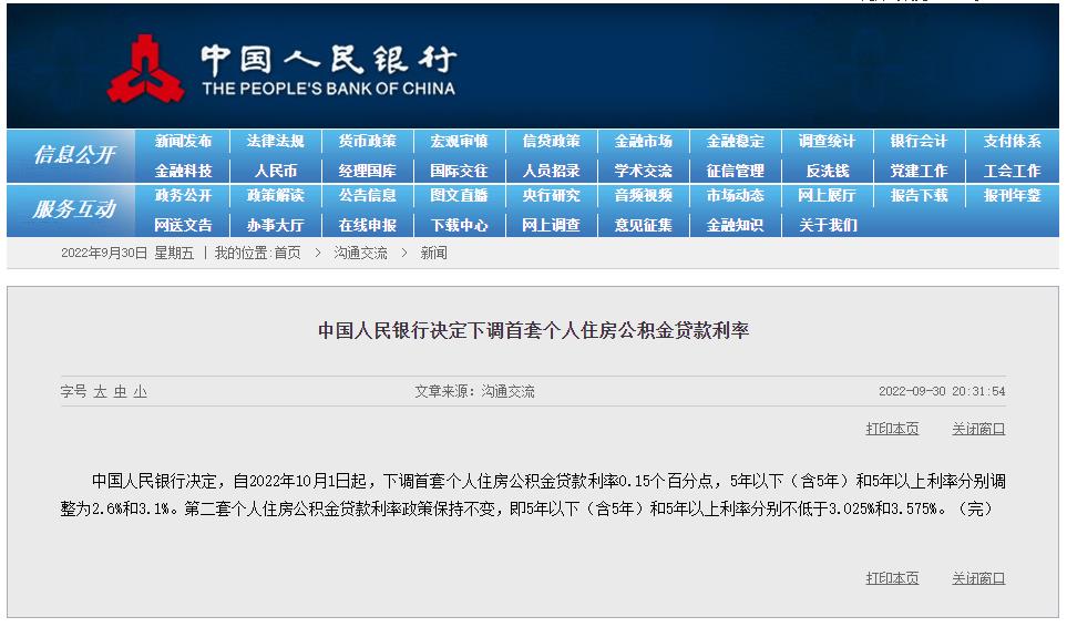 人民银行网站9月30日消息,人民银行决定下调首套个人住房公积金贷款利率。