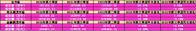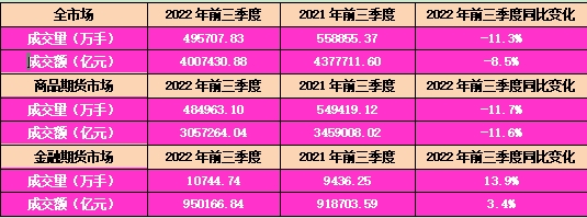 全国期货期权市场第三季度成交量和成交额分别为19.11亿手和143.26万亿元,同比分别增长2.08%和下降5.4%,环比分别增长26.37%和11.17%。