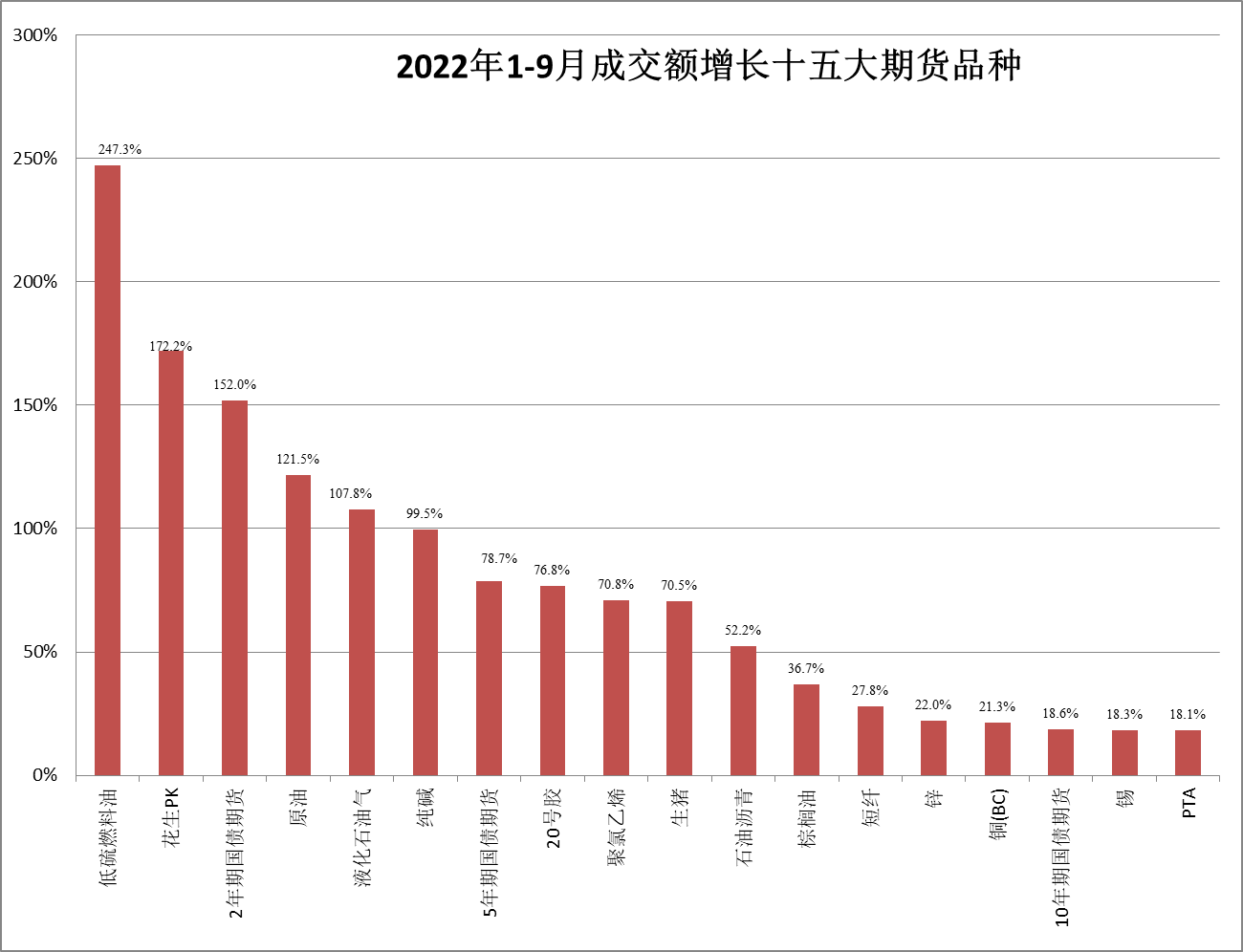 第三,2022年1-9月,最活跃期货品种中的甲醇、豆菜粕、玉米、乙二醇、棉花、原油、沥青、股指期货、植物油、钢材铁矿、国债期货、玻璃纯碱、金银、PTA、铜铝镍、聚烯烃期货成交量和成交额占比居前20位,但这些最活跃品种上半年出现成交规模仍下滑,仅有花生、PVC、生猪、纯碱、LPG、低硫燃料油、原油、铁矿石和国债期货等少数品种成交量同比增长;