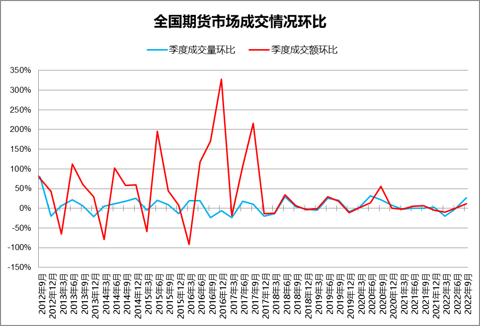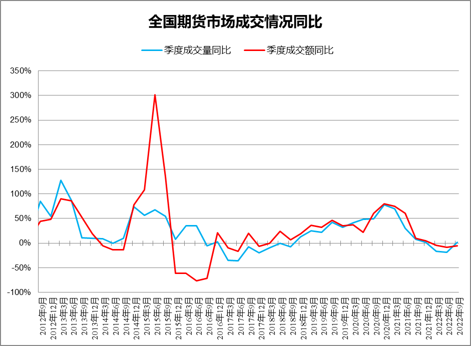 受全球地缘政治、美联储货币政策收紧、全球性高通胀持续、全球经济衰退强预期等因素宏观因素影响,叠加能源危机、粮食危机、主权债务危机和供应链危机等微观因素间接影响,2022年以来国内期货市场活跃度和交易量同比下降。