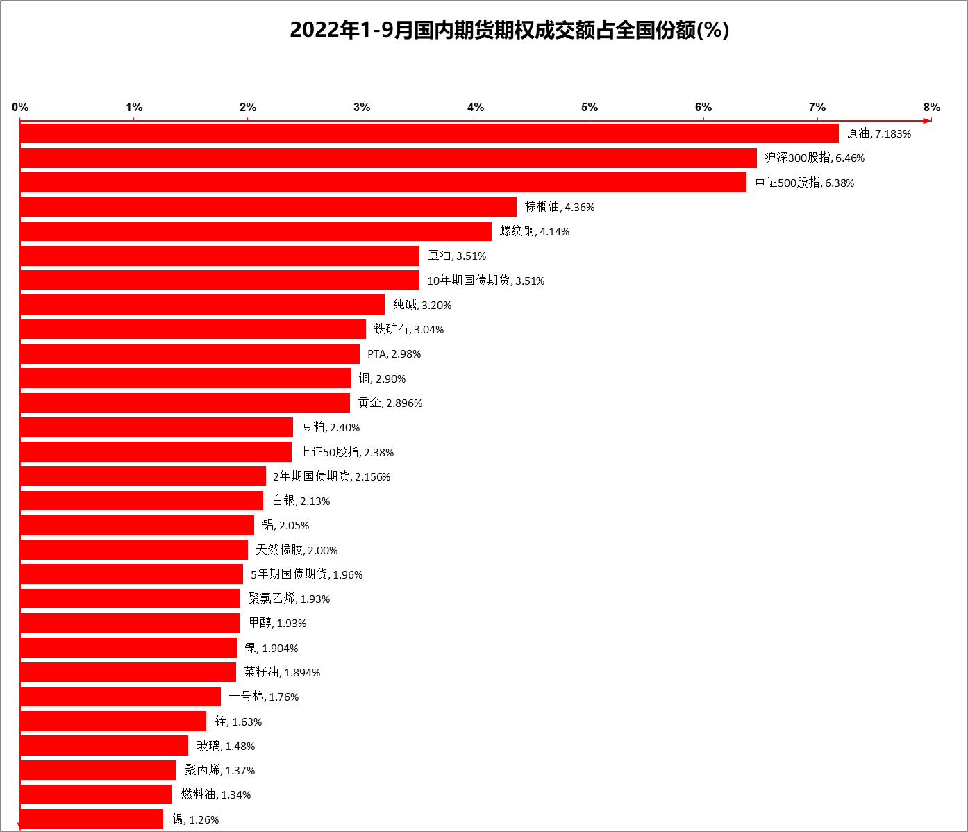 2022年前三季度,全市场成交额最大的30个品种分别是原油、沪深300股指、中证500股指、棕榈油、螺纹钢、豆油、10年期国债、纯碱、铁矿石、PTA、铜、黄金、豆粕、上证50股指、2年期国债、白银、铝、天然橡胶、5年期国债、聚氯乙烯、甲醇、镍、菜籽油、棉花、锌、玻璃、聚丙烯、燃料油、锡和石油沥青期货。以上品种市场占比分别为7.2%、6.5%、6.4%、4.4%、4.1%、3.5%、3.5%、3.2%、3.0%、3.0%、2.9%、2.9%、2.4%、2.4%、2.2%、2.1%、2.1%、2.0%、2.0%、1.9%、1.9%、1.9%、1.9%、1.8%、1.6%、1.5%、1.4%、1.3%、1.3%和1.3%。全市场成交额集中度CR10、CR20和CR30分别是44.7%、67.5%和83.4%。