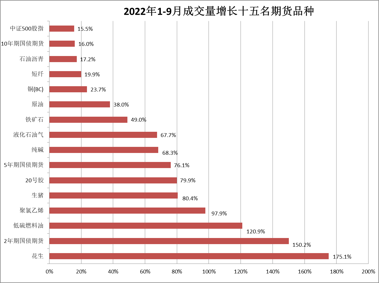 第四,2022年1-9月油脂油料板块异军突起,出现板块成交额同比增长5.7%;其中,花生和棕榈油期货成交额同比分别增长172%和37%,花生成交量同比增长175%、棕榈油成交量同比增长8%。
