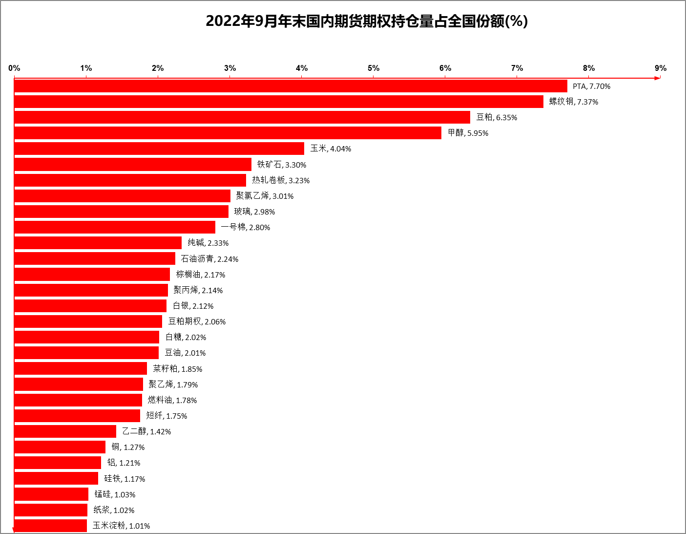 2022年9月末,全市场持仓量最大的30个品种分别是PTA、螺纹钢、豆粕、甲醇、玉米、铁矿石、热轧卷板、聚氯乙烯、玻璃、棉花、纯碱、石油沥青、棕榈油、聚丙烯、白银、豆粕期权、白糖、豆油、菜籽粕、聚乙烯、燃料油、短纤、乙二醇、铜、铝、硅铁、锰硅、纸浆、玉米淀粉和中证500股指期货。以上品种市场占比分别为7.7%、7.4%、6.4%、6.0%、4.0%、3.3%、3.2%、3.0%、3.0%、2.8%、2.3%、2.2%、2.2%、2.1%、2.1%、2.1%、2.0%、2.0%、1.9%、1.8%、1.8%、1.8%、1.4%、1.3%、1.2%、1.2%、1.0%、1.0%、1.0%和1.0%、。全市场持仓量集中度CR10、CR20和CR30分别是46.7%、67.5%和80.1%。