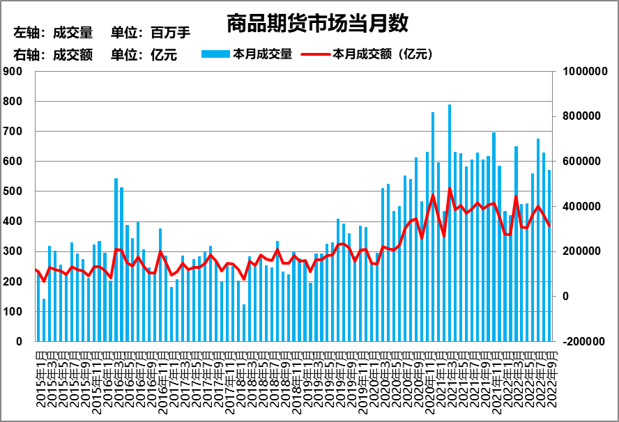 图:2015-2022年我国商品期货期权市场月度成交规模变化