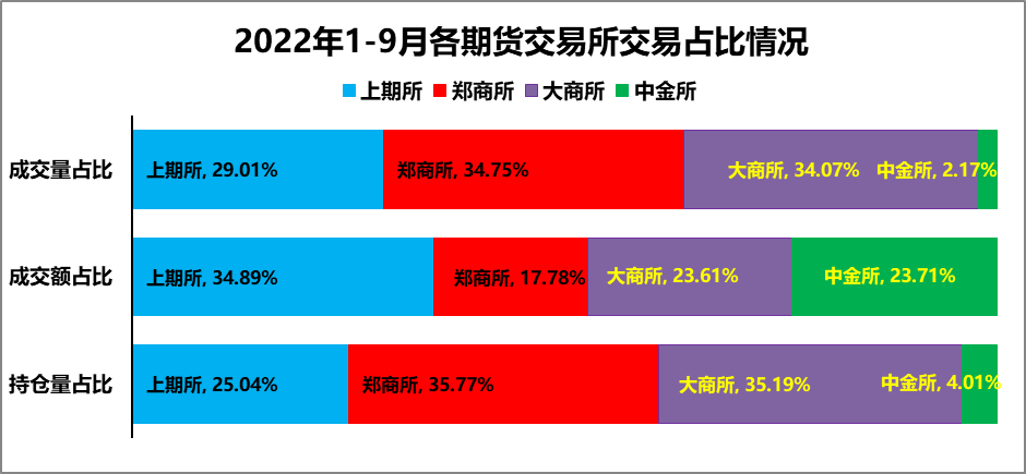 从金融期货市场看,2022年前三季度成交量累计达1.07亿手、成交额累计达95.01万亿元,同比分别增长13.9%和3.4%,分别占全国市场的2.2%和23.72%。