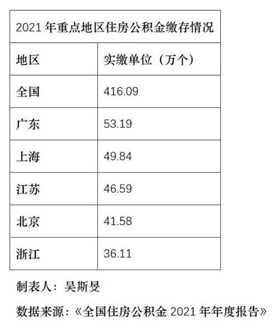 根据住建部、财政部和央行联合发布的《全国住房公积金2021年年度报告》,广东是当年住房公积金实缴单位数最多的省份,上海、江苏、北京、浙江紧随其后。根据该报告公布的数据计算,这5地住房公积金实缴单位数接近于全国实缴单位总量的55%。