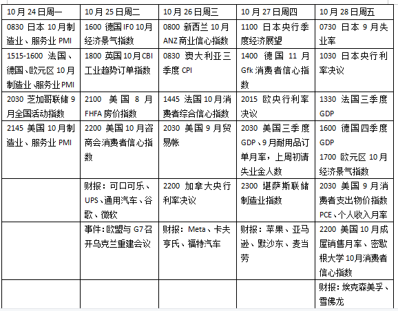 本周多国央行的动向将成为焦点,由于通胀接近10%,市场预期欧央行将连续第二次加息75个基点;在7月加息100个基点后,随着房地产市场降温,加拿大央行或考虑加息50基点/75基点以应对潜在经济风险;上周日本央行入场买入国债以缓和日元压力,但市场普遍认为最新货币政策会议中超宽松立场不会改变。同时,美国本周将公布三季度国内生产总值(GDP);欧美经济体采购经理人指数(PMI)或喜忧参半;美股财报季进入密集发布期,苹果、亚马逊等明星股将披露业绩。