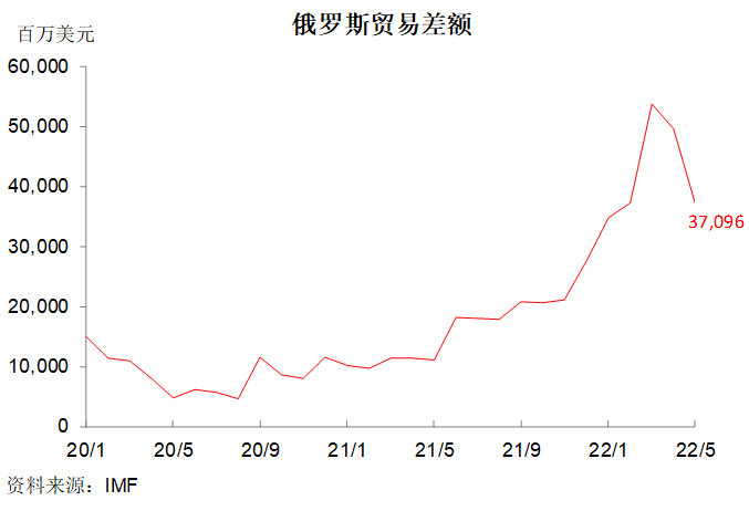 俄乌冲突爆发以后,美欧对俄罗斯商品尤其是能源产品实施出口制裁,旨在遏制俄罗斯出口与获取硬通货的能力。然而,由于欧洲各国对俄罗斯商品短期依赖性强且俄罗斯加大对亚洲的出口,俄罗斯贸易顺差并未出现断崖式下跌。2022年3月,俄罗斯贸易顺差达到历史最大值,为536.92亿美元。5月,俄罗斯贸易顺差为370.96亿美元,仍然保持了较高水平。