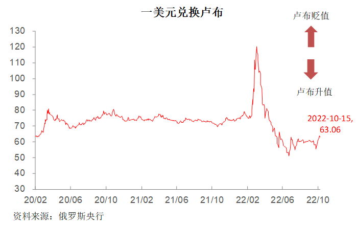 5月以来卢布对美元汇率达到了冲突前的更为强势的水平,显示出卢布具有较强韧性与抗压特性。10月15日,1美元兑换63.06卢布。