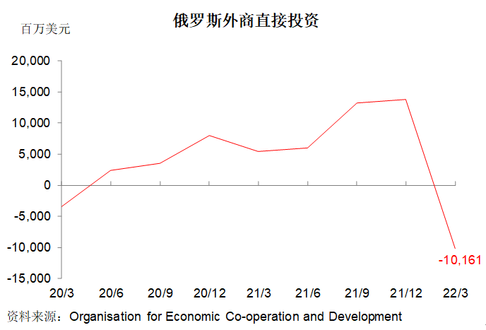在俄乌冲突爆发以及美西方制裁的双重打击下,在俄罗斯的外商开始大规模撤资。2022年一季度,外资净流出101.61亿美元,打破了此前三个季度外资净流入趋势。外资的撤出一方面损害了俄罗斯的制造业与生产能力,另一方面也无法为俄罗斯注入新的外部资金,对俄罗斯实体经济打击较为明显。