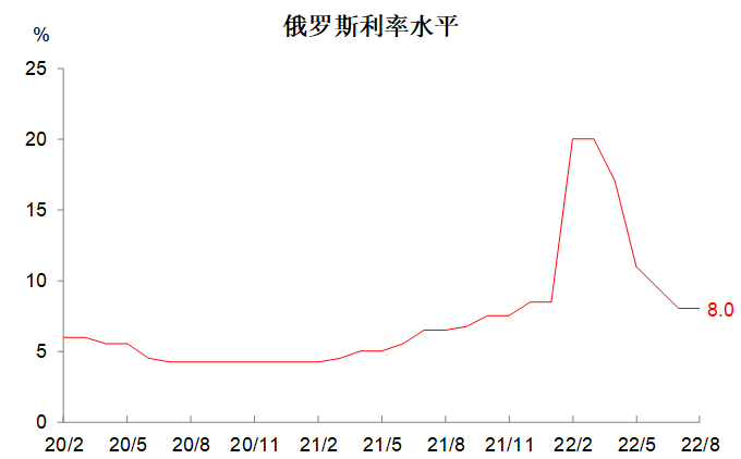 2022年2月底,为应对高通货膨胀及卢布贬值,防止资本继续外逃及挤兑现象,俄罗斯央行将利率由9.5%提高到20%。7月22日,俄罗斯利率下调至8%,逐渐恢复正常水平。利率水平的迅速回落,显示了俄罗斯对国内金融市场的稳定性具有一定的信心,也说明通胀水平在一定程度上得到控制。