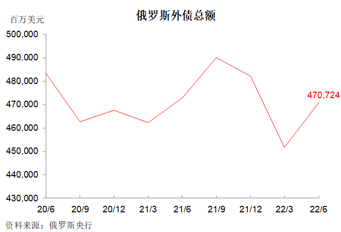 2022年一季度,俄罗斯外债总额为4513.94亿美元,较2021年四季度减少306.83亿美元,连续两个季度下降,降至2009年二季度以来的最低值。