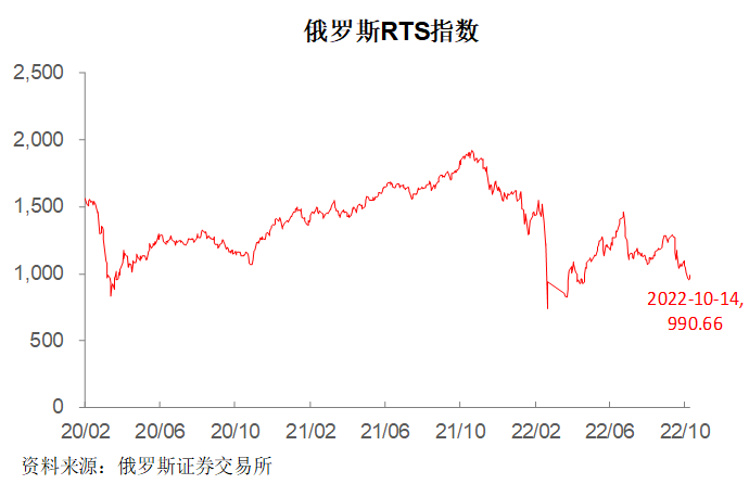 2021年10月底,俄罗斯股票RTS指数到达了2011年9月以来的高点后,在俄乌关系紧张情况下开启下跌模式。2022年2月下旬,受俄乌冲突爆发影响,RTS指数出现断崖式下跌,至2月底跌到最低点,之后开始反弹。以2022年2月24日作为起始日期,截至2022年10月18日,RTS股指表现甚至好于美国标普股指(下跌11.96%)。