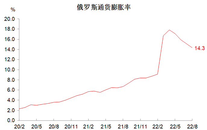 俄乌冲突爆发后,俄罗斯国内几乎所有商品价格都大幅上涨,卢布走弱、美西方制裁、民众抢购商品是推动物价上扬的主要原因。2022年2月,俄罗斯通胀率为9.2%。之后通胀率急剧攀升;4月俄罗斯通货膨胀达到最高点17.8%,之后连续4个月下降,但仍处于较高水平;8月份通货膨胀率为14.3%。俄罗斯的通胀水平遵循了全球通胀升高的走势。