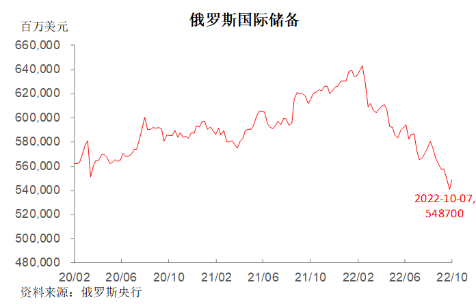 2022年2月18日,俄罗斯国际储备数量达到历史最高值,为6432亿美元。俄乌冲突爆发以来,俄罗斯国际储备出现下降。9月,俄罗斯国际储备降至5407亿美元,从最高点下降了1025亿美元。不过,总体来看,俄罗斯的国际储备仍具有较大体量,具备较强的抗风险与抗波动能力。
