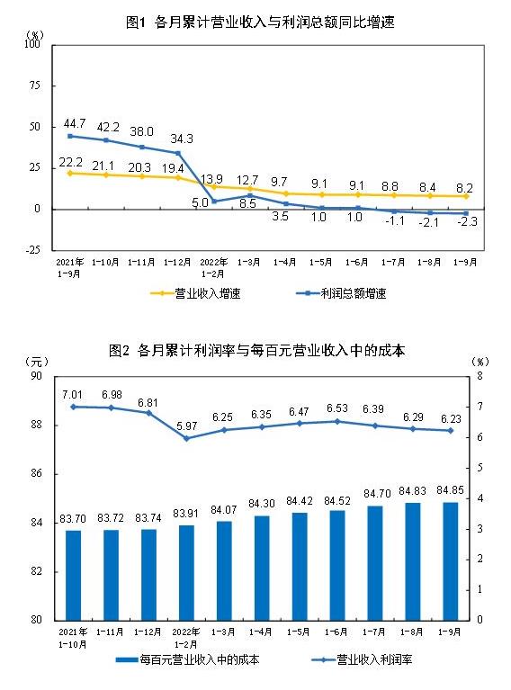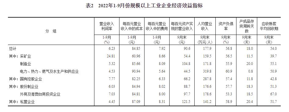 1—9月份,规模以上工业企业每百元营业收入中的成本为84.85元,同比增加1.06元;每百元营业收入中的费用为7.92元,同比减少0.51元。