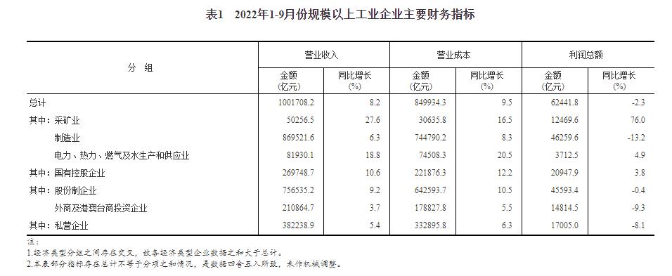 1—9月份,全国规模以上工业企业实现利润总额62441.8亿元,同比下降2.3%(按可比口径计算,详见附注二)。