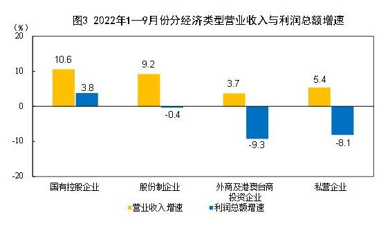 1—9月份,规模以上工业企业中,国有控股企业实现利润总额20947.9亿元,同比增长3.8%;股份制企业实现利润总额45593.4亿元,下降0.4%;外商及港澳台商投资企业实现利润总额14814.5亿元,下降9.3%;私营企业实现利润总额17005.0亿元,下降8.1%。