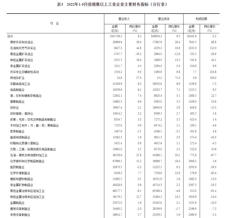1—9月份,在41个工业大类行业中,19个行业利润总额同比增长,22个行业下降。主要行业利润情况如下:石油和天然气开采业利润总额同比增长1.12倍,煤炭开采和洗选业增长88.8%,电气机械和器材制造业增长25.3%,电力、热力生产和供应业增长11.4%,化学原料和化学制品制造业增长1.6%,专用设备制造业下降1.3%,汽车制造业下降1.9%,计算机、通信和其他电子设备制造业下降5.4%,通用设备制造业下降7.2%,农副食品加工业下降7.5%,非金属矿物制品业下降10.5%,有色金属冶炼和压延加工业下降14.4%,纺织业下降15.3%,石油、煤炭及其他燃料加工业下降67.7%,黑色金属冶炼和压延加工业下降91.4%。
