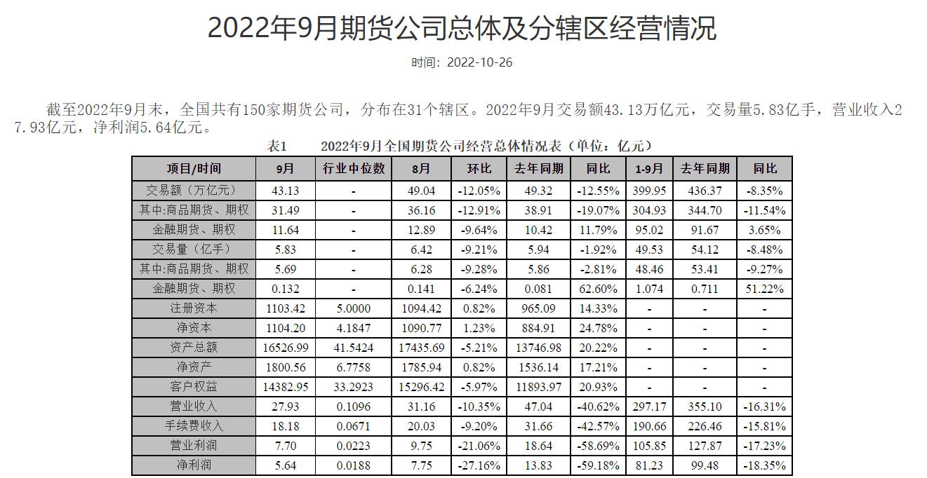 数据显示,9月份全国期货公司手续费收入18.18亿元,环比下降9.2%,同比下降42.57%;营业利润7.70亿元,环比下降21.06%,同比下降58.69%;今年前9个月,全国期货公司营业收入297.17亿元,同比下降16.31%;手续费收入190.66亿元,同比下降15.81%;净利润81.23亿元,同比下降18.35%。