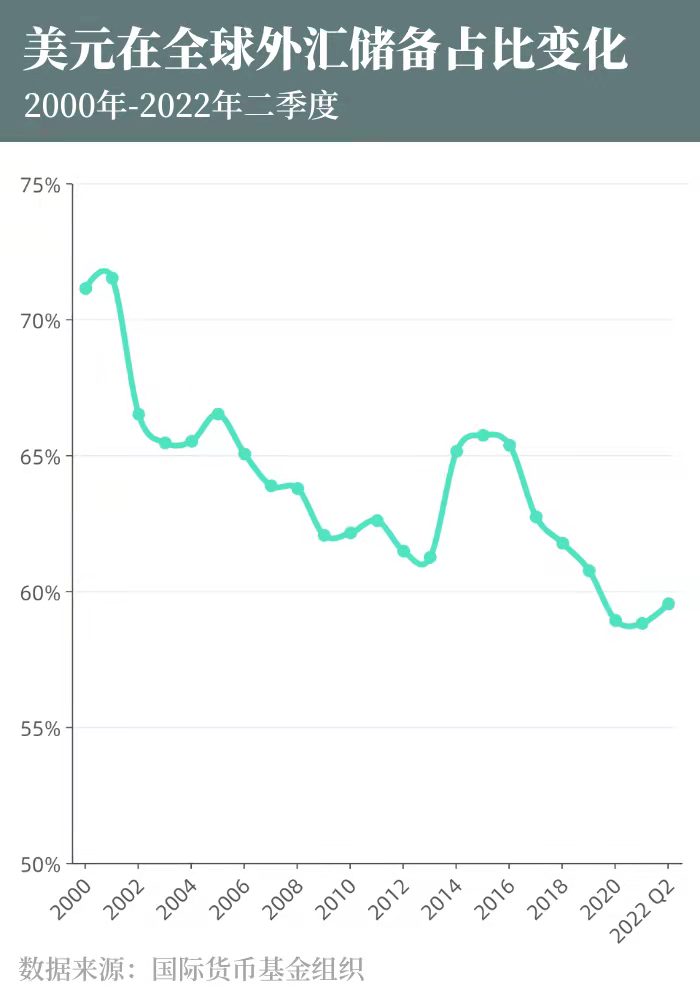 事实上,近年来美元国际地位已明显下滑。IMF数据显示,今年第二季度,美元在全球官方外汇储备资产中占比约为59.5%,而2001年美元占比曾一度高达72.7%。