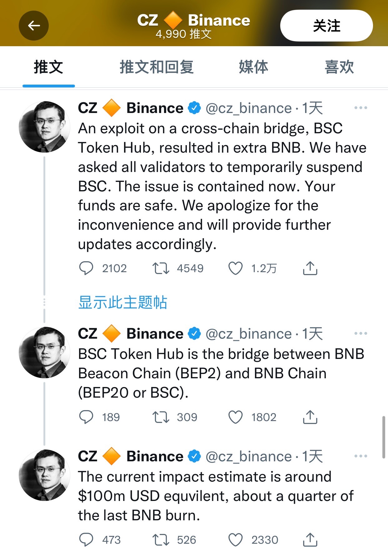 币安因“跨链桥”漏洞被黑客攻击后,赵长鹏连续发布推文