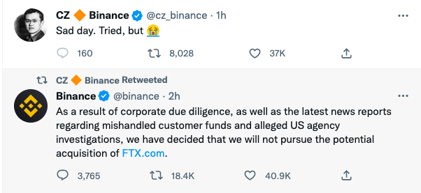 然而11月10日,币安就宣布,基于尽职调查的结果,以及有关对客户资金不当处理、美国监管部门调查等新闻报道,该公司决定放弃对FTX的潜在收购。