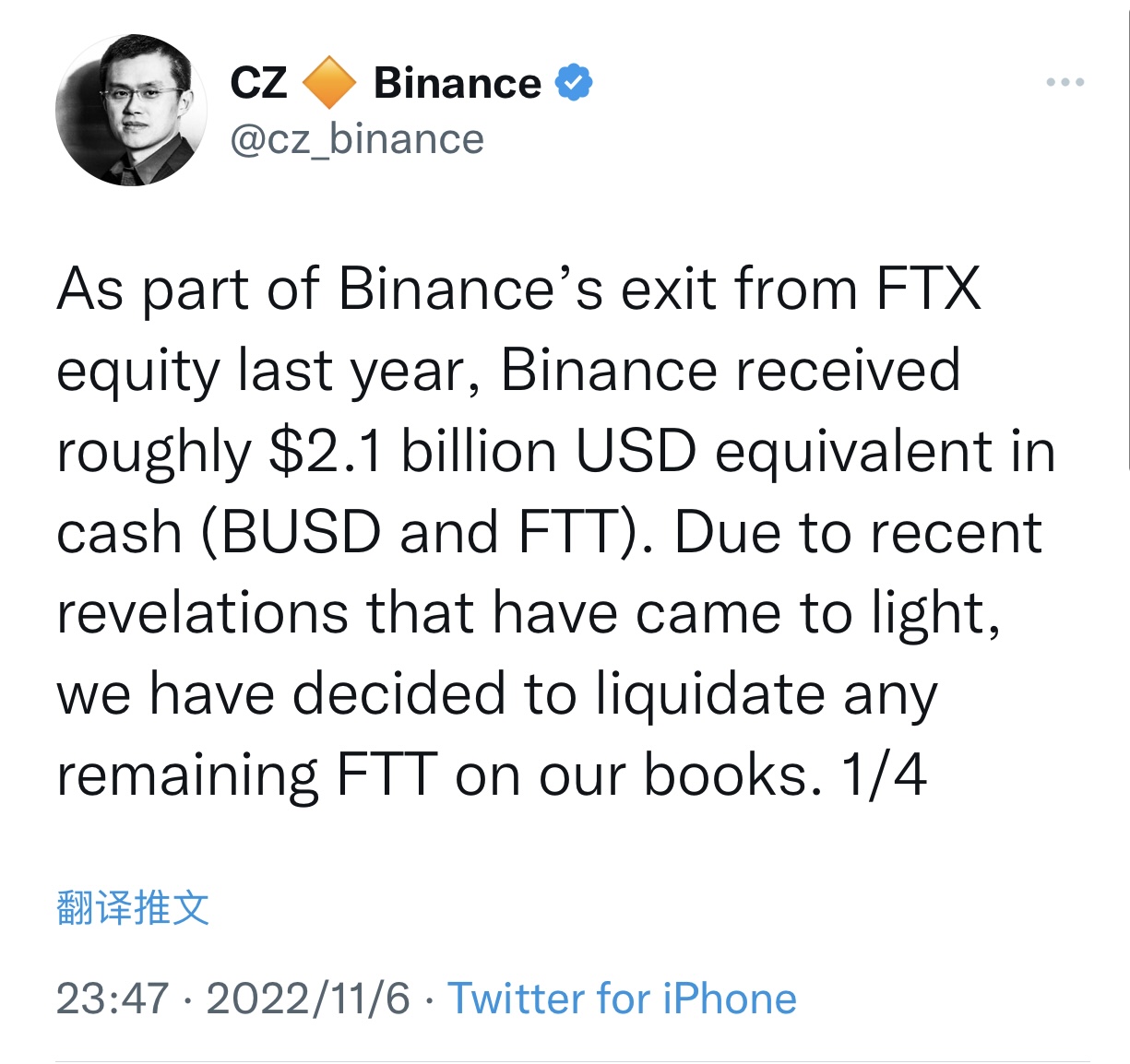 币安创始人赵长鹏11月6日发布的推文之一