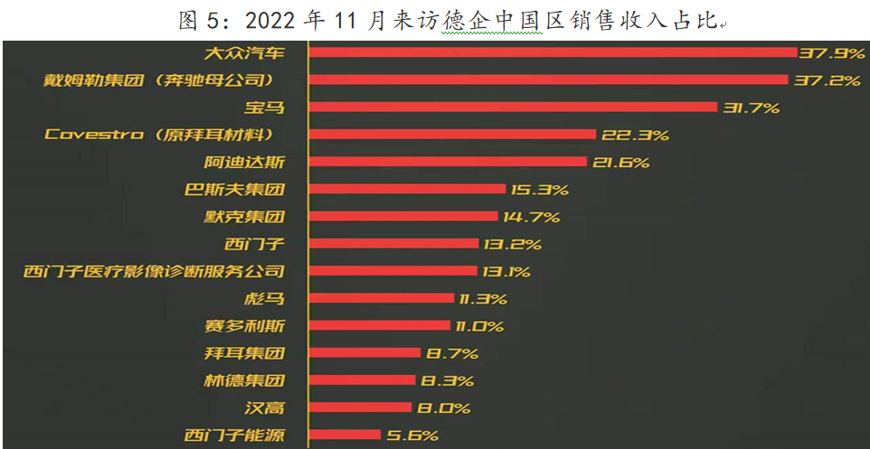 昂贵的能源价格使欧洲制造业不得不考虑战略东移,并且这让它们离最终消费市场更近。俄罗斯廉价能源供应为欧洲创造了制造优势,但随着欧洲决定跟俄罗斯能源脱钩,这一优势反过来限制了欧洲制造业扩张。同时中国凭借巨大需求市场与稳定的对外开放政策,使欧洲放弃美国“脱钩”战略。2022年9月,德国化工巨头巴斯夫宣布在中国广东湛江投资100亿欧元打造世界级化工基地,以逃离欧洲昂贵的能源成本,同时更靠近终端消费市场——2021年德国巴斯夫在中国区收入占比达15%。2022年11月4日,朔尔茨带领12名企业高管访华,这些企业大多在中国有非常高的销售收入占比(下图)。