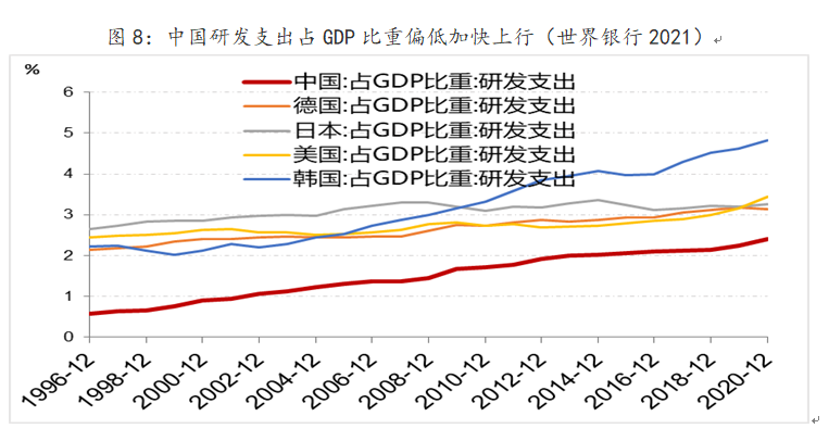 制造业发展必须依赖技术革新。制造业具有规模效应,一旦取得制造技术突破,制造壁垒下降导致大规模生产,产品价格竞争激烈,产品溢价或利润下降。规模效应使制造业必须持续创新,才能维持产品竞争力与溢价,维持企业基业长青。过去西方众多企业凭借在中国市场获得盈利,进一步加大研发,保持了竞争力。中国化工企业研发投入跟世界领先企业还有较大差距。从整体上来看,中国研发投入占GDP比重跟全球发达国家比较,依然偏低(图8)。