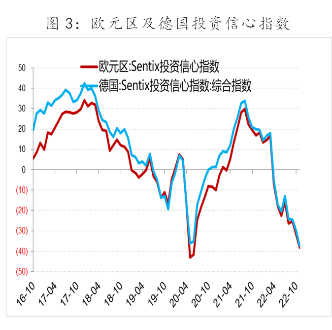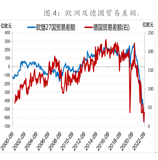 持续高涨的能源价格不仅让欧洲投资信心下降(图3),同时让欧洲及德国面临有数据记录以来最差的贸易差额(图4)。2022年8月德国电价涨至0.5欧元/千瓦时,约3.4元/度,约是中国工业电价的7~8倍。高电价对德国高耗电行业形成打击,德国钢铁、电解铝、合成氨单吨成本较中国价格分别贵约188美元、5110美元、3280美元。2022年8月欧盟27国贸易逆差-577亿欧元(出口额进口额)。其中,德国2022年二季度部分商品出现贸易逆差,能源品贸易逆差-174亿美元,有机化学品贸易逆差-144亿美元,电气设备机械设备贸易逆差-50亿美元,金属制品塑料制品无机化学品等贸易逆差-10亿美元左右。