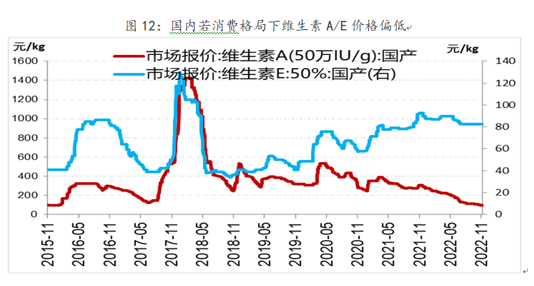 由于欧洲天然气紧张,维生素A/E产量可能紧张。全球维生素A产能格局是欧洲占比约50%(帝斯曼7500吨,巴斯夫6000吨,安迪苏5000吨),其余约50%产能在中国,维生素E欧洲产能约占36%(帝斯曼3万吨,巴斯夫2万吨)。由于欧洲天然气短缺,欧洲整体计划减少15%的工业天然气用量。巴斯夫此前警示,若天然气供应量低于最大需求的50%,巴斯夫将不得不缩减或完全关闭其在德国路德维希港的基地。作为全球最大的维生素生产地区,欧洲天然气供应紧张将可能导致维生素产量不足而涨价。国内企业将受益于维生素涨价,代表性公司如新合成、安迪苏等。