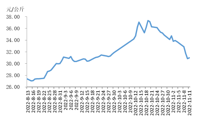 据农业农村部信息中心和山东卓创资讯股份有限公司联合监测,2022年第44周(即2022年11月7日-11月11日,以下简称本周),16省(直辖市)瘦肉型白条猪肉出厂价格总指数的周平均值为每公斤31.91元,环比下跌6.4%,同比上涨37.0%,较上周收窄19.4个百分点。